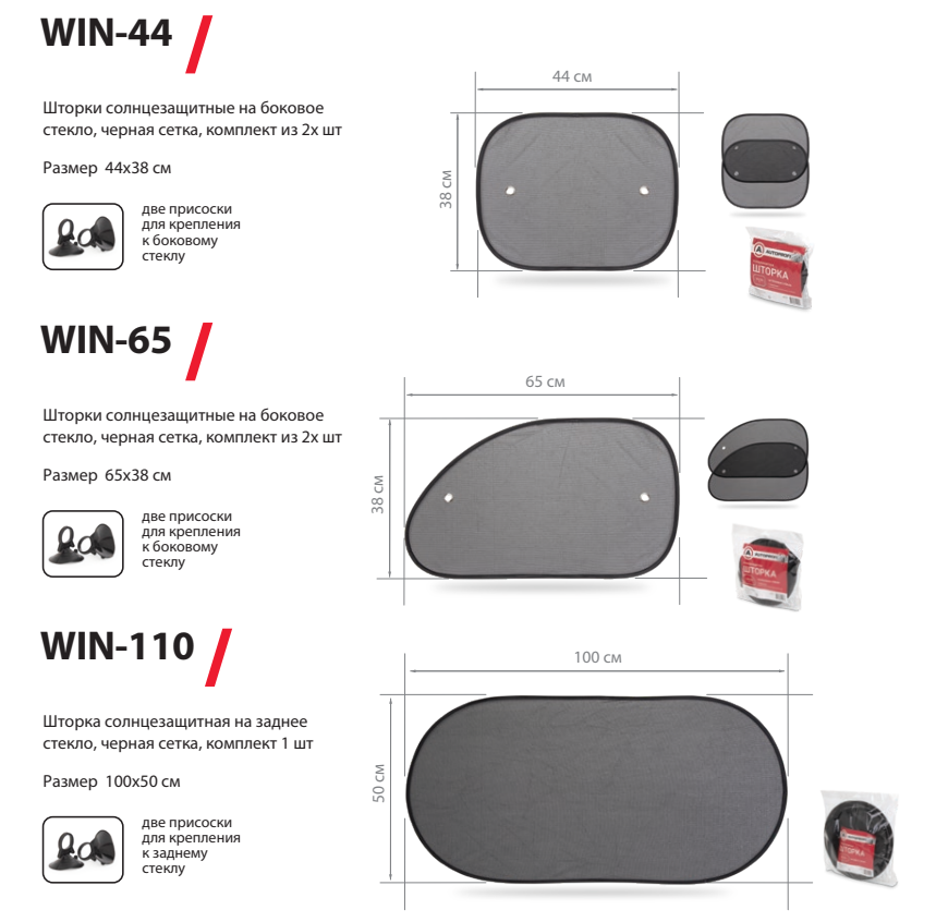 Солнце может нагревать элементы интерьера и досаждать пассажирам не только через лобовое стекло, но и через боковое остекление. Используйте солнцезащитные боковые шторки WIN-65 для переднего ряда, WIN-44 – для заднего и WIN – 110 для заднего стекла.