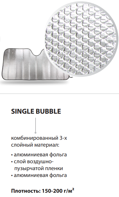 SINGLE BUBBLE - комбинированный 3-слойный материал: алюминиевая фольга, слой воздушно-пузырчатой пленки и алюминиевая фольга. SUN-150 (М/L/XL), SUN-180 (М/L/XL), SUN-200 (М/L/XL)