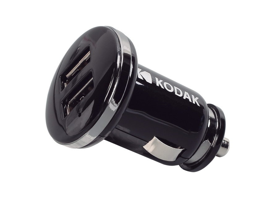 Автомобильное зарядное устройство “KODAK”, 2 USB-порта по 2,4  А с системой быстрой зарядки, постоянное напряжение на входе: 12-24В, напряжение и сила тока на выходе: 5 В/2,4 А, итого 3,1 А.