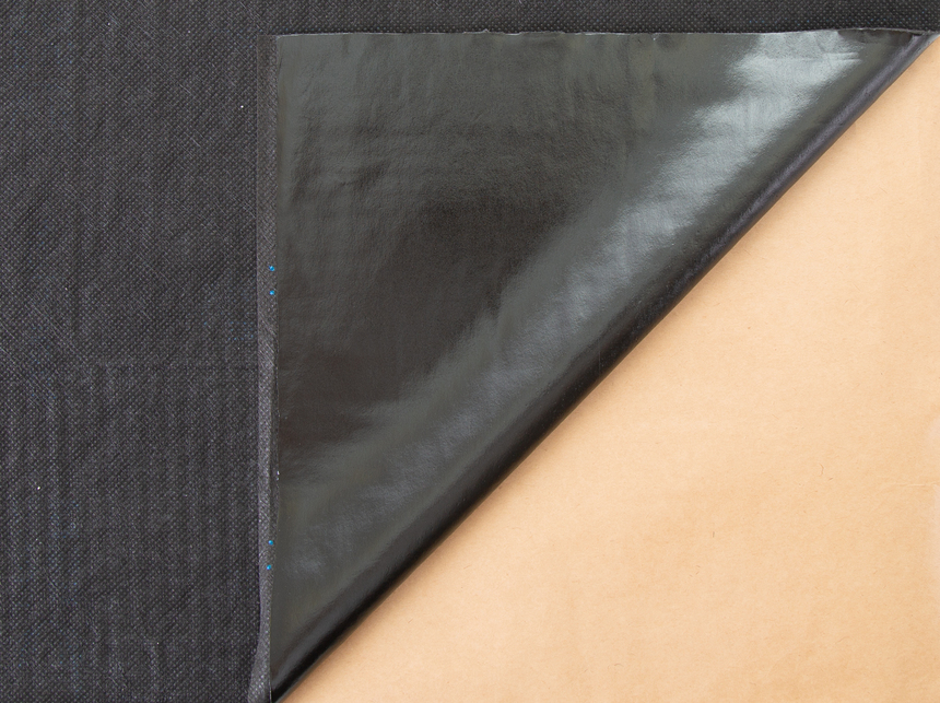 Вибродемпфирующий материал, представляющий собой 2 мм бутилкаучуковую композицию, имеющую нетканое полотно в виде лицевого покрытия и силиконизированную бумагу, закрывающую монтажный слой.