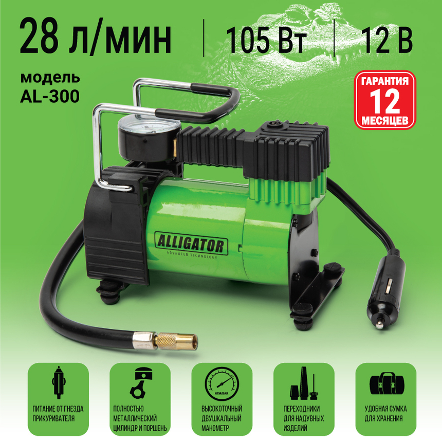 Переходники для мячей и матрацев делают модель практически универсальной. Мощность компрессора — 105 Вт, а максимальное давление — 10 ATM. Компрессор для накачивания ALLIGATOR AL-300 — оптимальное решение эконом-класса для современного автовладельца, мотоциклиста и велосипедиста. Работает при температуре от -20 до +50 °С. В комплекте — удобная сумка для хранения и переноски. Гарантия 1 год.
