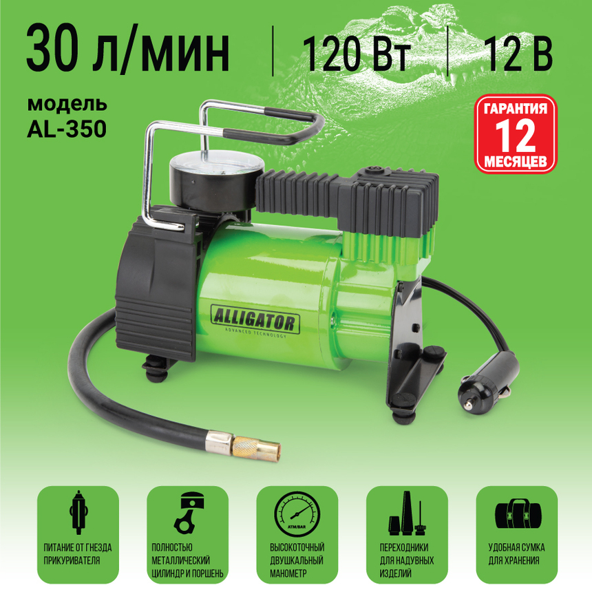 Встроенный высокоточный манометр измеряет давление в ATM и PSI. Питание компрессора осуществляется от прикуривателя. Компрессор ALLIGATOR AL-350 оптимален по своим характеристикам для владельцев автомобилей малого и среднего класса, а также для мотоциклистов и велосипедистов. Работает при температуре от -20 до +50 °С. В комплекте — удобная сумка для хранения и переноски. Гарантия 1 год.