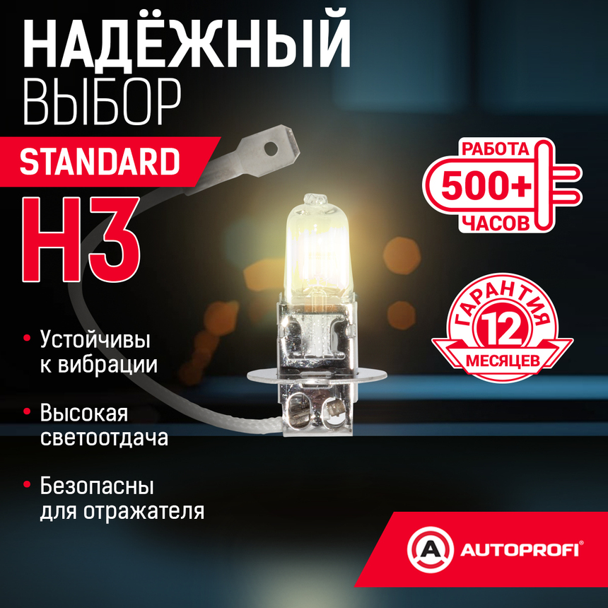Линейка галогеновых ламп AUTOPROFI STANDART – это доступный и одновременно необходимый компонент для исправной работы головного света современного автомобиля. Ключевое преимущество ламп линейки AUTOPROFI STANDART – наилучшее соотношение стоимости, ресурса и эффективности.