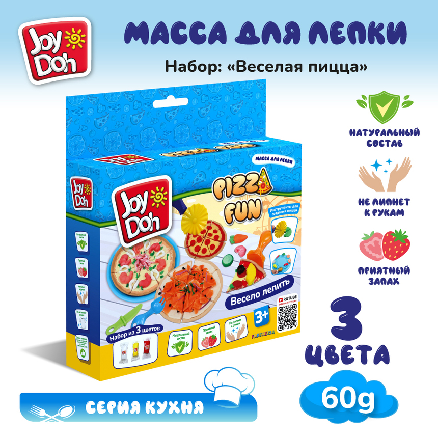 Масса для лепки Joy Doh, набор PIZZA FUN - ВЕСЕЛАЯ ПИЦЦА, нож для пиццы, 5 аксессуаров, 3 пакетика с тестом, (3 х 20г.)