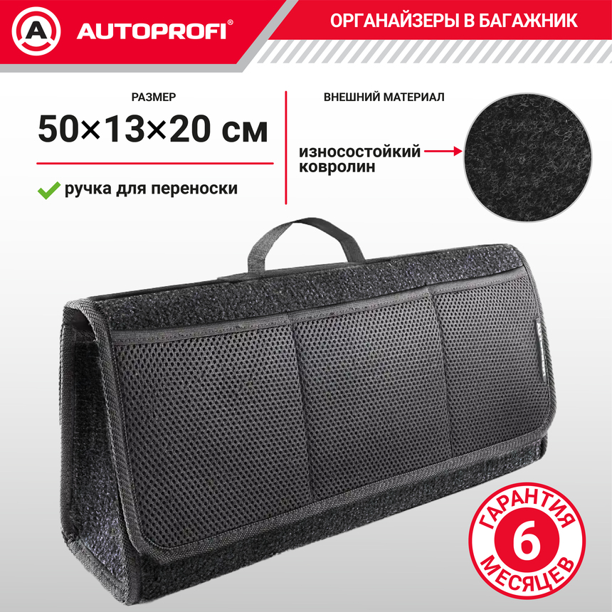 Автомобильный органайзер-сумка из ковролина. Цвет черный с характерной фактурой. Материал износостойкий и рассчитан на хранение в багажнике. В таком органайзере можно разместить автохимию, инструменты, автоаксессуары. Размер 50х13х20 см.