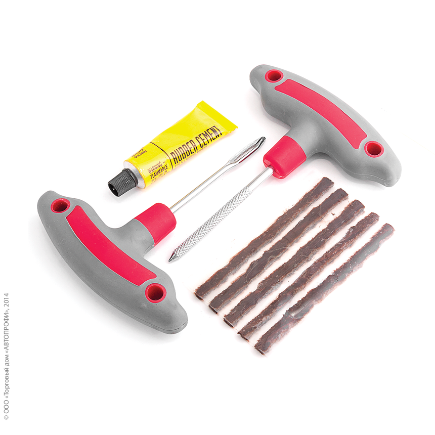 Незаменимый набор для всех автомобилистов. Позволяет в любой момент устранить прокол бескамерной шины и продолжить поездку. Если диаметр отверстия не превышает 6 мм., вам не потребуется ехать в мастерскую – исправить ситуацию можно даже на обочине. Затраченное время на ремонт покрышки, как правило, не превышает 10 минут. В комплект входят: шило-рашпиль, апликатор жгута, эластичные жгуты (5 штук), клей. Рукоятки шила и апликатор имеют удобную форму.