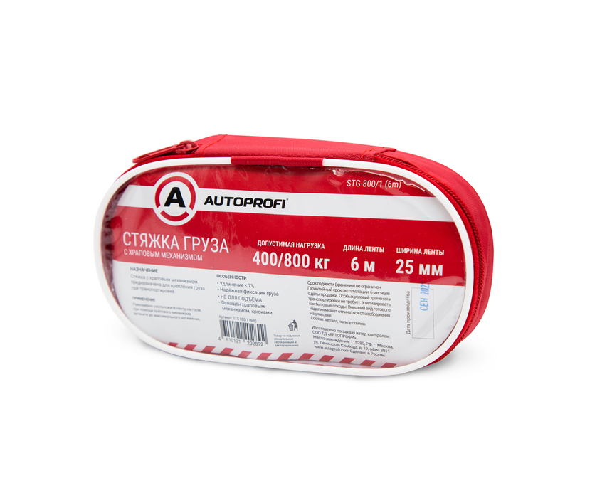 Стяжка груза, храповый механизм 110 мм, ширина ленты 25 мм, 400/800 кг (прямое стяжное усилие/стяжное усилие при обхвате), сумка.