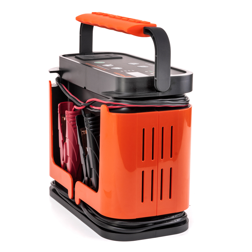 Компактное зарядное устройство с регулируемой силой тока: 2А для мотоциклов, снегоходов, газонокосилок, 6А для аккумуляторов емкостью 15-60 ампер-час, 10А для зарядки стандартных автомобильных аккумуляторов и 15А для больших АКБ с емкостью от 50 ампер-час. Также есть порт USB для подзарядки мобильных гаджетов. На панели устройства можно выбрать силу тока, тип АКБ, а также проверить напряжение батареи.